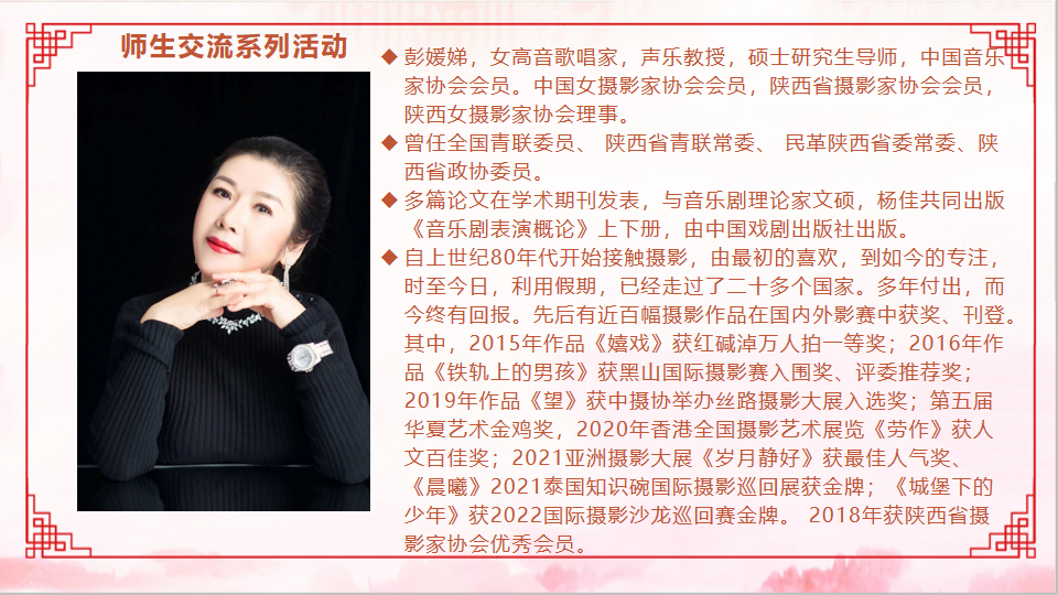 交流活动以彭媛娣教授的摄影作品展拉开序幕,彭教授对其行走二十多个国家拍摄的近30张优秀作品进行介绍,给同学们分享其亲身摄影经历,其中包括2016年黑山国际摄影赛,《铁轨上的男孩》获入围奖、评委推荐奖;2019年中摄协举办丝路摄影大展,《望》获入选奖、第五届华夏艺术金鸡奖;2020年香港全国摄影艺术展览,《劳作》获人文百佳奖;2020年华夏摄影大赛,《沙漠取水》获金牛奖;2021年泰国知识碗国际摄影巡回展,《晨曦》获金牌奖;2022年国际摄影沙龙巡回赛,《城堡下的少年》获金牌奖。除此之外,彭媛娣教授在讲述影像拍摄画面的同时,给同学们传授人生感悟和哲理,以及摄影方面的技巧,包括构图的方式、光线的采集、拍摄画面的故事性等都作为构成一部好作品的考虑要素。彭媛娣教授画中景,景中意,意中情的陈述,不仅通过摄影作品带领同学们感受世界各地的不同场景,也将音乐放进图片中感受音乐与图画艺术相结合的魅力。