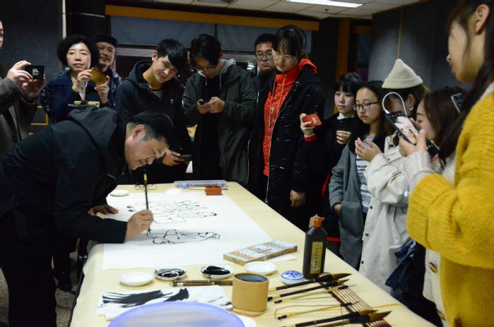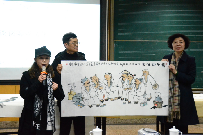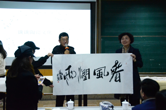漆德三做了题为“陶瓷与音乐”的专题讲座。漆德三以自己研究陶瓷文化多年的阅历,通俗易懂地介绍和展示了“陶瓷就是中国故事”的内涵。荆志忠根据几十年来对陶瓷研究的心得,讲授了陶瓷文化的历史。讲解过程中,刘勇、熊远堂分别作画,让学生们感受了中国传统绘画的过程,并将作品赠与了学工部。
