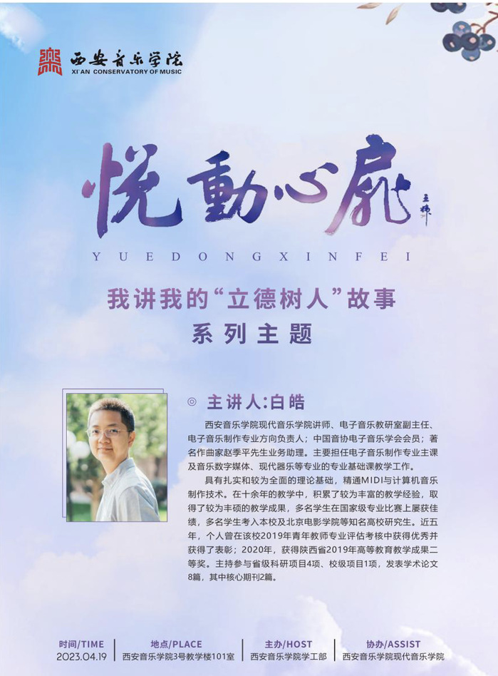为深入学习贯彻习近平新时代中国特色社会主义思想,进一步巩固我校“我讲我的“立德树人”主题故事成果,2023年4月19日下午,由学工部主办,现代音乐学院协办的“悦动心扉”《我讲我的“立德树人”故事》系列主题讲座,在西安音乐学院“一站式”学生事务管理中心开展。此次活动的首讲嘉宾是现代音乐学院电子音乐教研室副主任白皓,学工部朱锐主持。