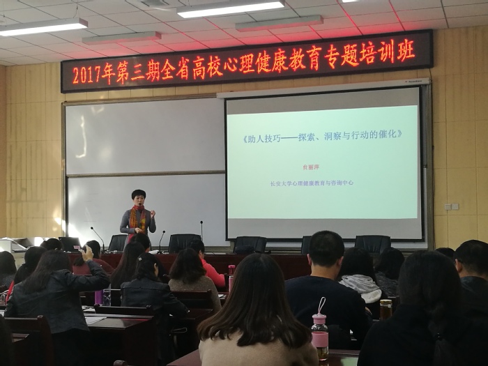 2017年9月9日至13日,省委高教工委在陕西教育干部培训中心举办2017年度第三期全省高校心理健康教育专题培训班。全省各高校专职心理健康教育教师及获得三级以上资质证书的辅导员共计85人参加了培训,我校教师孙琳琳参加培训。