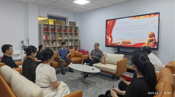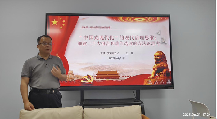 为进一步抓好基层党支部学习贯彻习近平新时代中国特色社会主义思想主题教育,持续深入学习领会党的二十大精神,6月21日下午,校党委副书记王刚参加所在党支部活动,并以《中国式现代化的现代治理思维:细读党的二十大报告和著作选读的方法论思考》为题,为学工部、团委全体党员讲授专题党课。