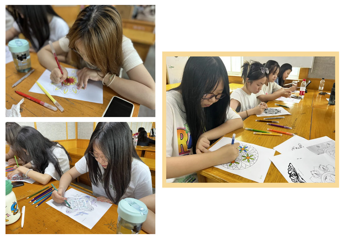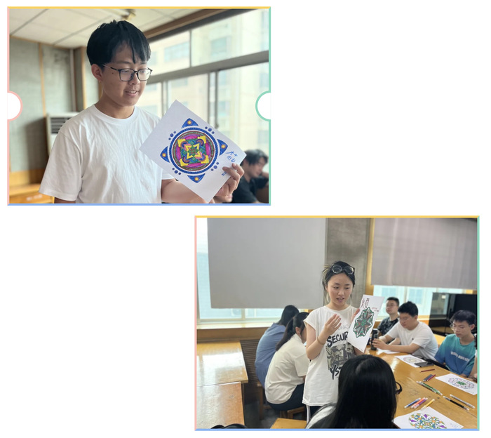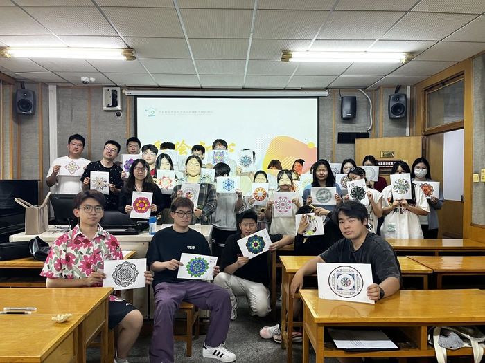 随后,在舒缓的音乐声中,同学们进行闭目冥想,通过深呼吸、放松身体,进入内心世界,静心回顾和感受最近一周的情绪和想法。冥想结束后,同学们利用手边的纸笔,开始进行曼陀罗绘画,将内心的想法和情绪通过不同的颜色和绘制方式呈现于画纸之上。