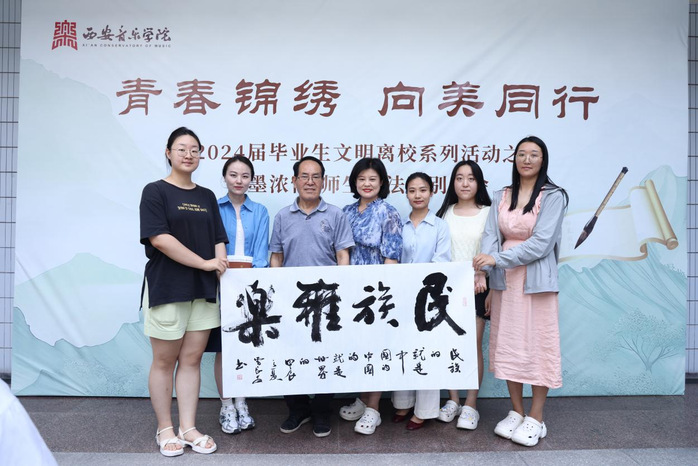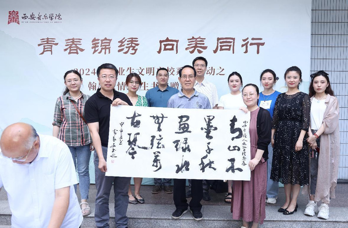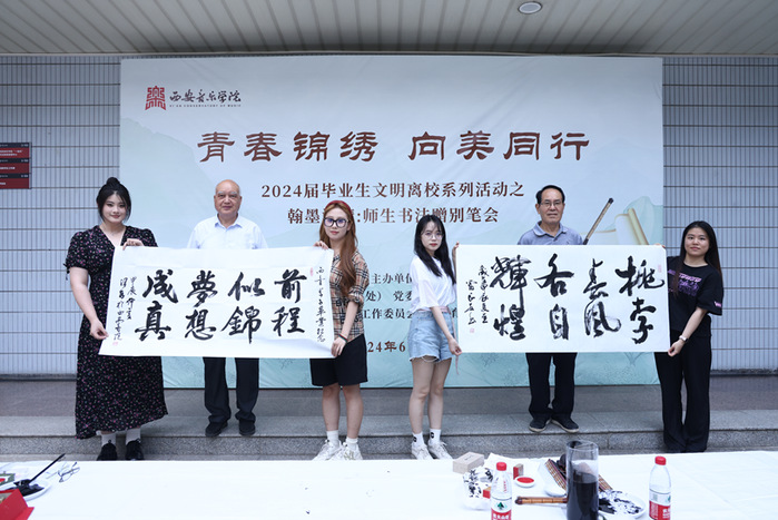 蝉鸣盛夏,骊歌轻扬。毕业季的脚步已悄然临近,6月25日下午,2024届毕业生文明离校系列之师生书法赠别笔会活动在学工小院顺利举行。活动由党委学生工作部(处)、党委宣传(统战)部、关心下一代工作委员会和校美育中心联合主办,以“青春锦绣 向美同行”为主题,旨在弘扬传统文化,在校园内营造浓厚的文化氛围,传递学校对2024届毕业生的真挚祝福和殷切希望,进一步提升我校以文化人、以美育人实效。院长王刚出席,学工部部长张凌主持,各院系辅导员、班主任、毕业学生代表及学工队伍人员参与。