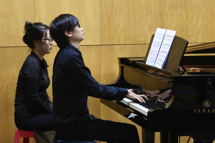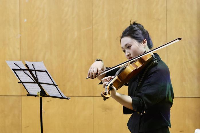 声乐系国家奖学金获得者刘亦宸则带来了歌剧《白毛女》的选段《恨似高山仇似海》。他以出色的演唱技巧和深厚的情感投入,将这一经典唱段演绎得淋漓尽致。管弦系国家奖学金获得者陈珊如和她的搭档李季雨演奏《Mozart's Duo for Violin and Viola in G, K423, 1st movement》。