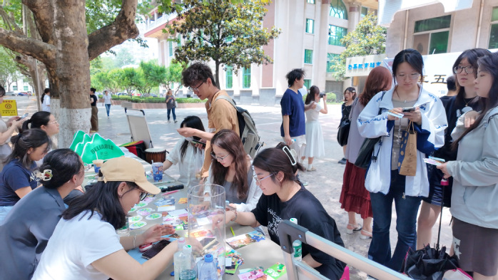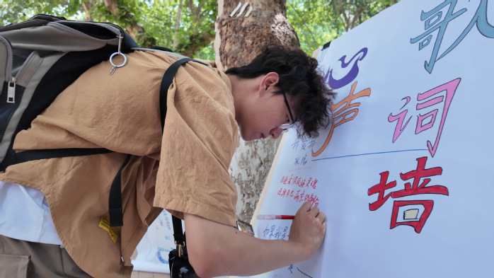 在艺术疗愈区,“点歌台”“彩虹墙”“心声歌词墙”“音乐拼贴诗”“节奏解压区”都吸引了众多师生参与。同学们通过抽卡解锁专属情绪BGM,用音乐疗愈自我;通过色彩表达内心情感,拼凑“五月心灵彩虹墙”;在心声歌词墙上,把心事写成歌,把情绪写成诗,在歌词墙上创作属于自己的旋律;用歌词重组,创作处于自己的“拼贴诗”,表达内心的情绪,重组自己的快乐。