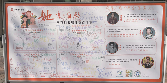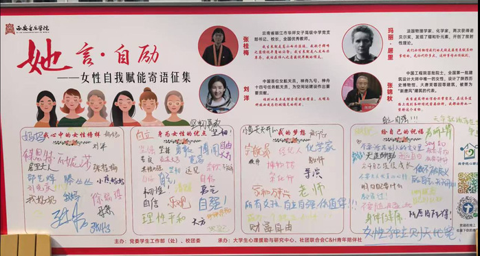 为庆祝第115个国际劳动妇女节,构建友爱团结的校园文化场域。 3月7日,党委学生工作部联合校团委在乐善阁和芒果餐厅门口发起“她言·自励——女性自我赋能寄语征集”主题活动,此次活动由大学生心理援助与研究中心、社团联合会C&H青年陪伴社联合承办。活动通过“女性榜样”“自身优点”“梦想”“祝福”四大主题留言墙,吸引数百名师生参与。