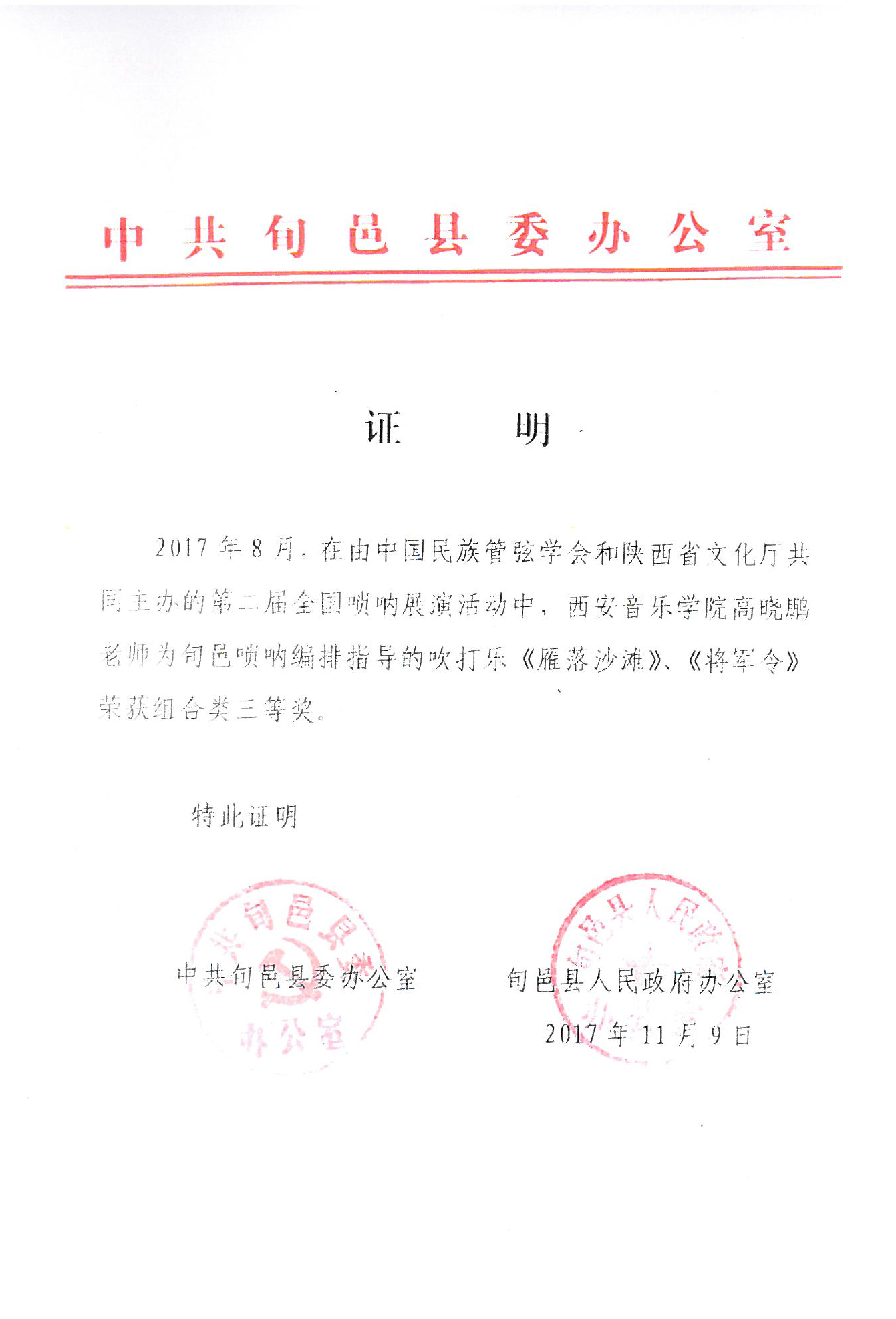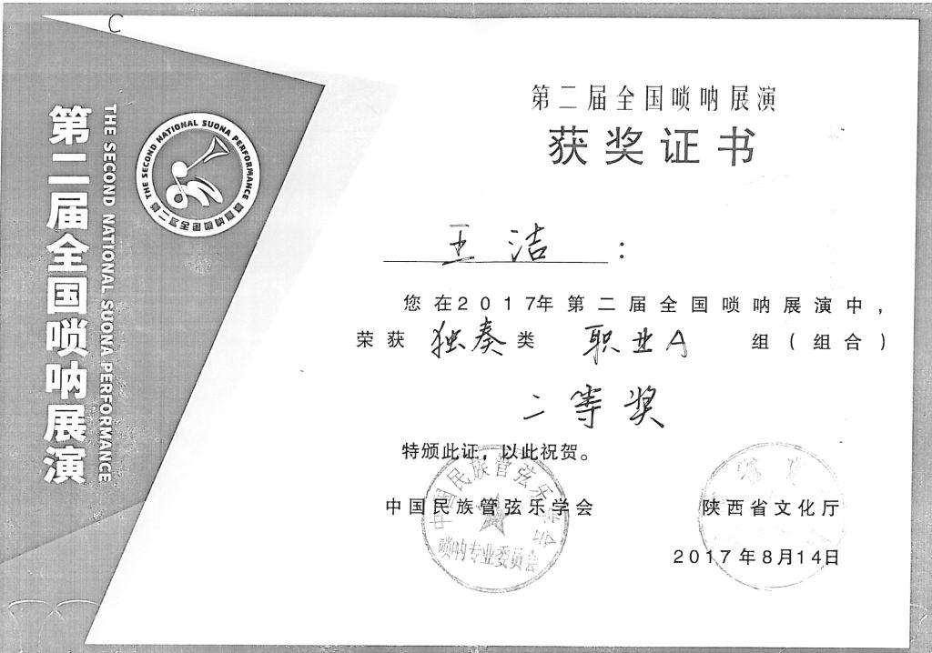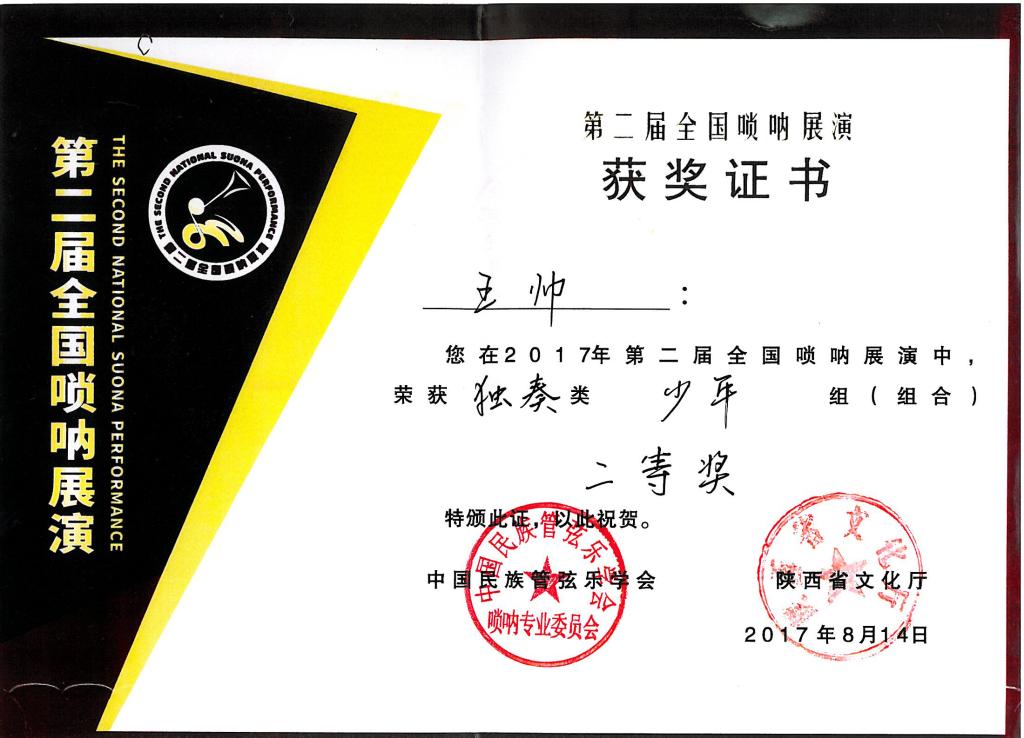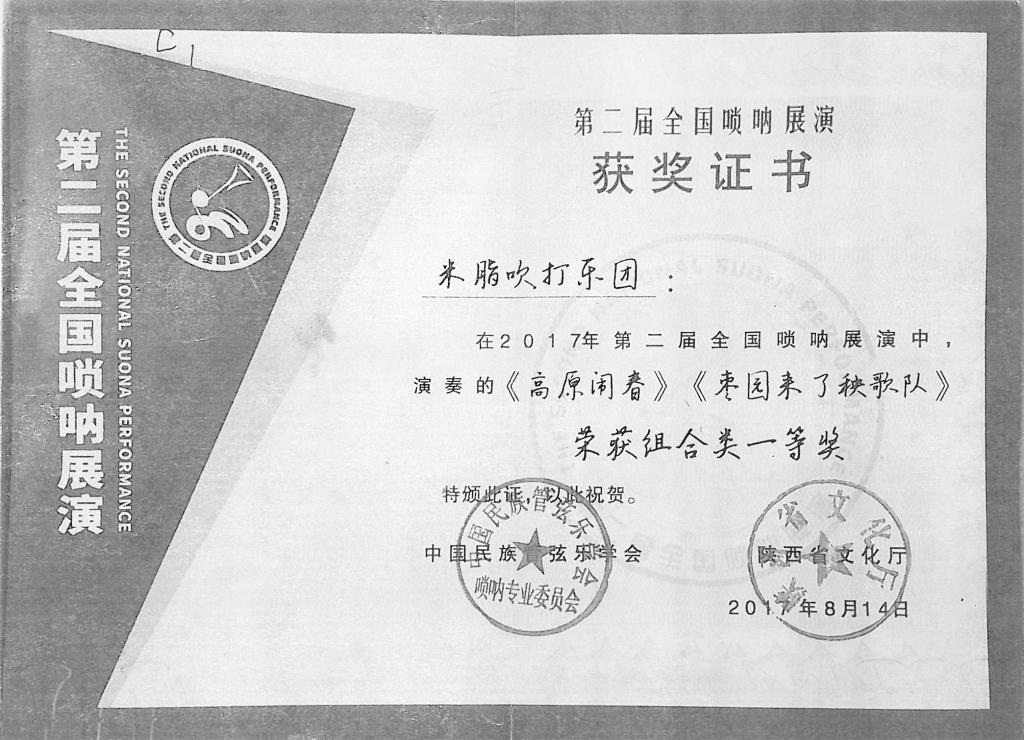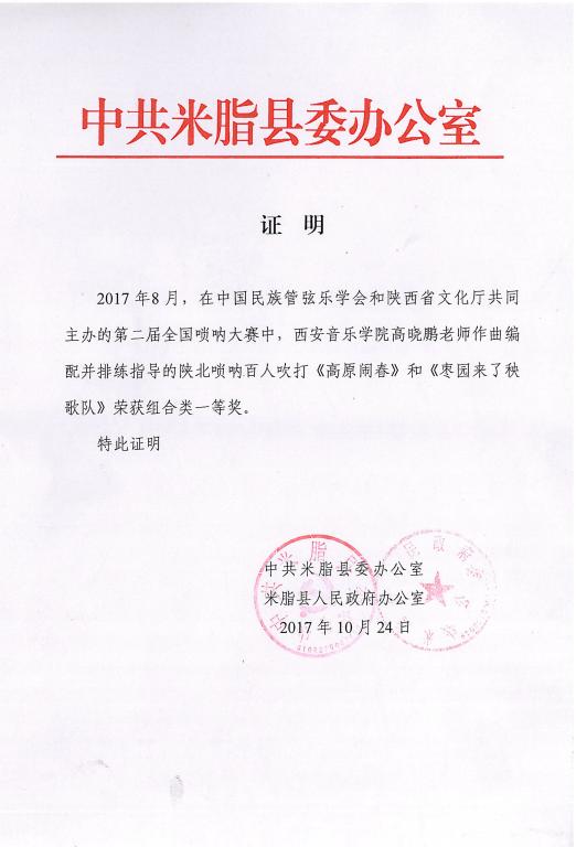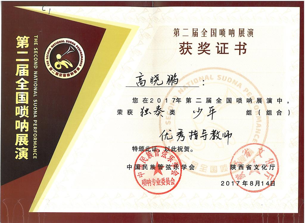 2017年8月,在中国民族管弦乐学会和陕西省文化厅,米脂县委县政府共同主办的第二届全国唢呐大赛上,培训考级中心主任高晓鹏教授所带学生在此次大赛中分获职业A组二等奖一名,三等奖一名,少年组二等奖一名及优秀奖两名。高晓鹏教授荣获优秀指导教师奖。由他本人创作、编排的米脂百人唢呐吹打(高原闹春)(枣园来了秧歌队)荣获组合类一等奖。