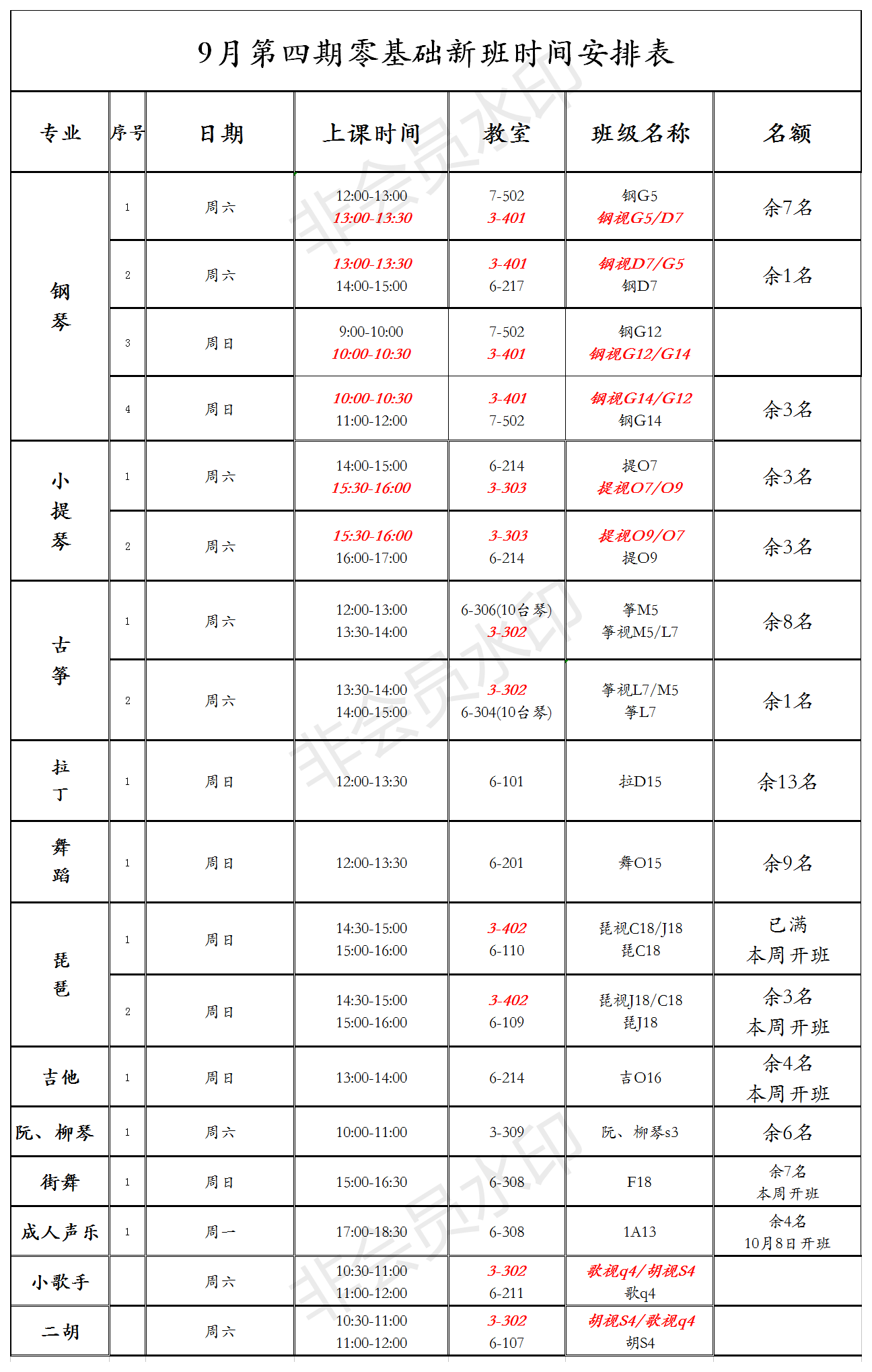 表格内红色字体为该专业视唱练耳课(音乐理论基础)上课时间。