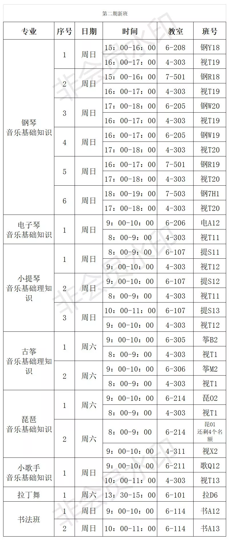 培训考级中心2019年8月第二期各专业零基础新班招生信息现已公布。因名额有限,请各位学员选好合适自己时间的班级后,到音乐学院培训中心一楼办公室报名交费。