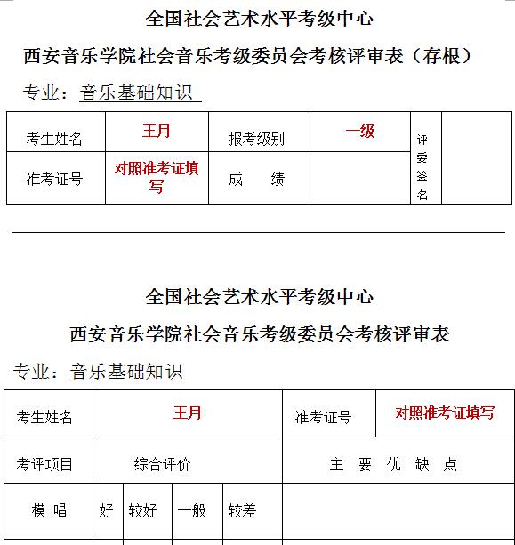 西安音乐学院社会音乐考级委员会考核评审表(音乐基础知识)