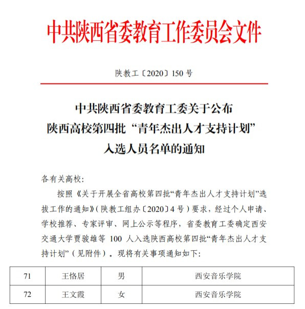 2020年7月17日,陕西高校第四批“青年杰出人才支持计划”人员名单公布,我校管弦系王恪居、音乐学系王文霞2名教师成功入选。