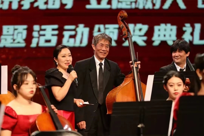 颁奖典礼现场,在管弦系大提琴教研室室内乐团的师生们演奏完《我和我的祖国》之后,演奏低音提琴的76岁西音退休老教师杨宏业受到了大家的关注。杨宏业老师从业数十年、桃李芬芳,今天仍站在西音的舞台上为大家演奏,正是对老一辈西音人春风化雨、润物无声的最好诠释。
