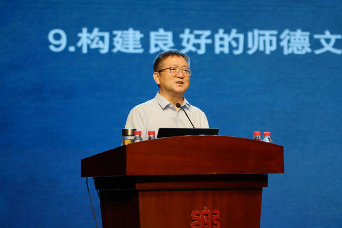 王彬武带领大家重温了习近平总书记关于教育的重要论述,引导教师从政治站位、思想高度上认识到新时代加强师德师风建设的重要性。他围绕师德师风建设的时代特征、守住底线红线、提高师德师风建设能力三个方面,系统阐释了师德师风的深刻内涵,强调师德是高素质专业化教师的必修课。