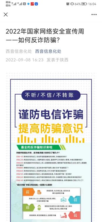 活动期间,学校官方和信息化处公众号分别推出《2022年国家网络安全宣传周,这些你需要了解!》《2022年国家网络安全宣传周——如何保护个人信息安全?》和《2022年国家网络安全宣传周——如何反诈防骗?》三篇推文宣传,向全校师生普及网络安全知识,增强大家的网络安全意识和防护技能,引导学生安全上网、文明上网,建文明校园,做文明学子。人文学院组织学生自编自导自演了2022年国家网络安全宣传周宣传片《一位黑客的自述》,让学生身临其境,提高网络安全防范意识。