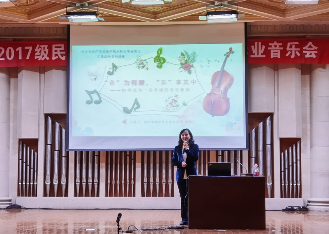 4月13日,学校教师发展中心与音乐教育学院联合举办基础教育音乐学科系列讲座的第五讲开讲。这一讲本次系列讲座的最后一次活动,由西安市碑林区东羊市小学大队辅导员、陕西省优秀教学能手、音乐教师李娟主讲。讲座题目是《“音”为有爱,“乐”享其中——如何成为一名幸福的音乐教师》。音乐教育学院2021届毕业生及学校部分师生聆听讲座。