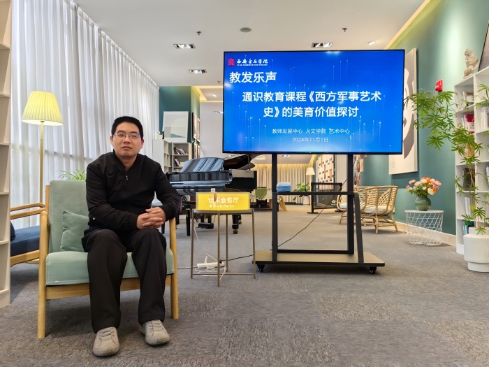 11月1日下午,教师发展中心联合人文学院、艺术中心举办“教发乐声”系列研讨活动。本次活动主题为通识教育课程《西方军事艺术史》的美育价值探讨,人文学院郭朋弟老师作主旨发言。教师发展中心及部分院系师生参与研讨。