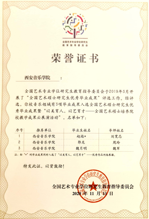 在2021年4月17日召开的“全国艺术专业学位研究生教育指导委员会2020年院校工作会议”上,我校三项专业学位研究生教育成果荣获“全国艺术硕士研究生优秀毕业成果”奖,本次评选经各培养单位严格遴选,学校积极推荐,教指委评选,网上公示,我校三项成果获奖,获奖者分别为:赵逊(导师:刘宽忍教授)、郭龙(导师:周玲教授)、魏月明(导师:魏军教授)。赵逊的毕业成果同时入选了教指委开展的“以美育人,以艺育才”——优秀作品网络展播。这是我校近年来学科建设与研究生人才培养的重要成果。