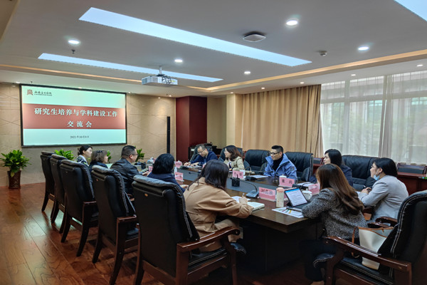 上午,三校“研究生培养与学科建设交流会”在机关第一会议室召开,我校研究生部主任郭强、副主任陈卉及全体工作人员参会。郭强对四川音乐学院究生处、武汉音乐学院研究生部的各位老师来访表示热烈欢迎,并对近年来三校研究生教育的交流合作表示充分肯定。