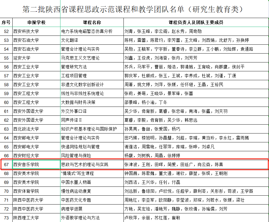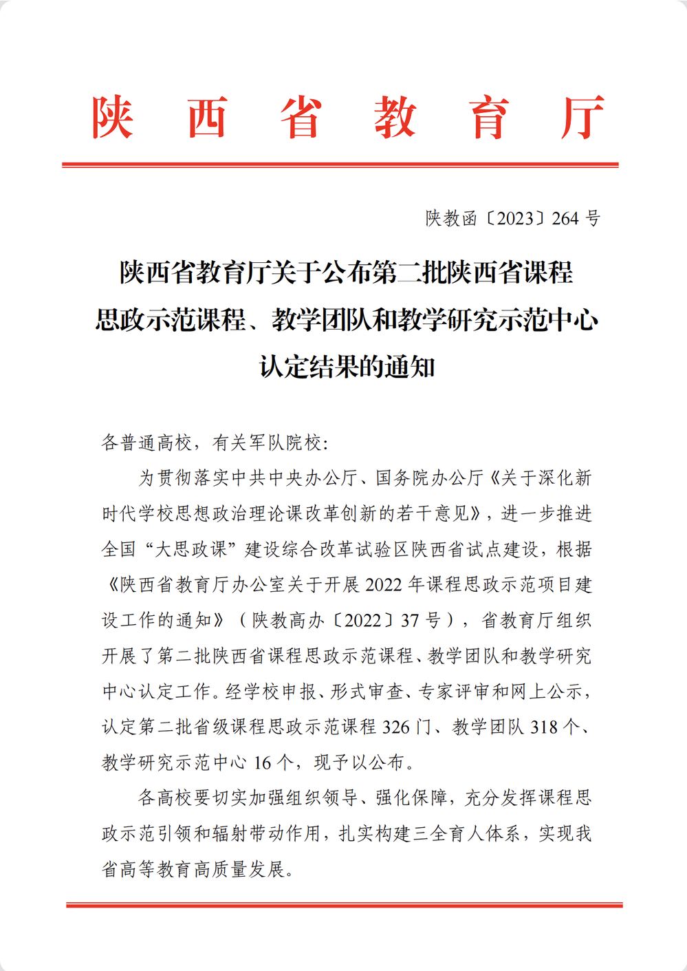 为贯彻落实中共中央办公厅、国务院办公厅《关于深化新时代学校思想政治理论课改革创新的若干意见》,进一步推进全国“大思政课”建设综合改革试验区陕西省试点建设,根据《陕西省教育厅办公室关于开展2022年课程思政示范项目建设工作的通知》( 陕教高办〔2022〕37号),省教育厅组织开展了第二批陕西省课程思政示范课程、教学团队和教学研究中心认定工作。我校高度重视,精心组织校内外专家评审、公示、申报,顺利完成前期申报工作。省教育厅组织形式审查、专家评审和网上公示,我校张津波教授主持的《思政与艺术的理论与实践》最终被评为“第二批省级课程思政示范课程和教学团队(研究生教育类)”,这是我校继张立杰教授主持《艺术+思政的理论与实践》2021年荣获首批陕西省课程思政示范课程和教学团队(研究生教育类)之后的再次获奖。
