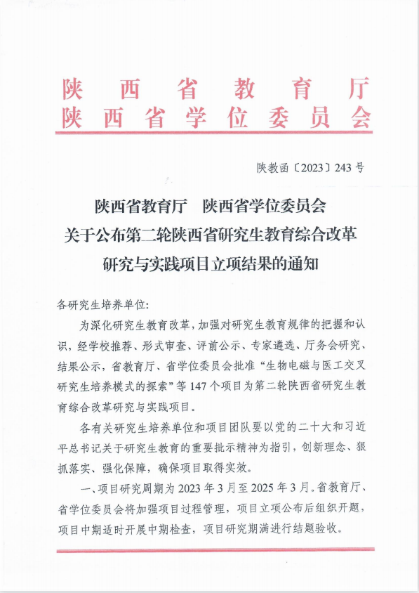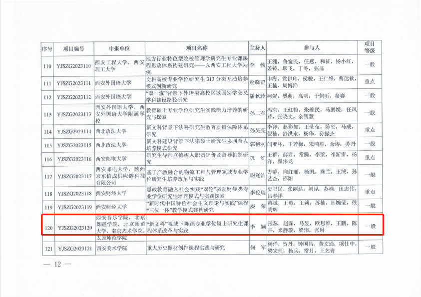 为深化研究生教育改革,提升研究生教育质量,根据《陕西省教育厅办公室陕西省学位委员会办公室关于做好2022年陕西省研究生教育综合改革研究与实践项目申报工作的通知》(陕教位办〔2022〕4号)要求,经学校推荐、公示、省教育厅厅务会研究、公示,由我校李颖教授主持的《“新文科”视域下舞蹈专业学位硕士研究生课程改革与实践》获批第二届陕西省研究生教育综合改革研究与实践项目。这是继李宝杰教授主持的《艺术硕士研究生培养中的“专业性”“实践性”“创造性”原则研究》获批首届陕西省研究生教育综合改革研究与实践项目之后,我校再次获得该项目。