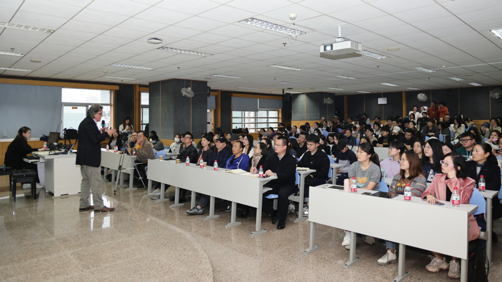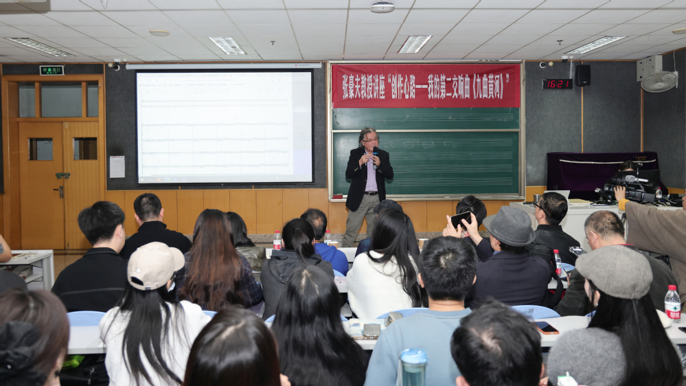接着,张豪夫教授和师生们分享了自己学习创作的经历以及音乐创作观的形成演变过程。张豪夫教授讲到:世界上有两本书,一本书是有字的书,即读万卷书,一本书是无字之书,即行万里路。通过讲述自己在国外所见的风景,在国内外所经历的见闻,结合中国传统文化,张教授总结道:“我们每个人开始学习创作时都在寻找自己的风格,这可能是一辈子的事,也是一件很难的事。不过即便如此,我们也应该去感受外边的大千世界,去了解世界上各种不同的音乐,不同的文化,去寻找并建立最适合自己的个人风格来...”这便是张豪夫教授对“读万卷书、行万里路”的诠释。