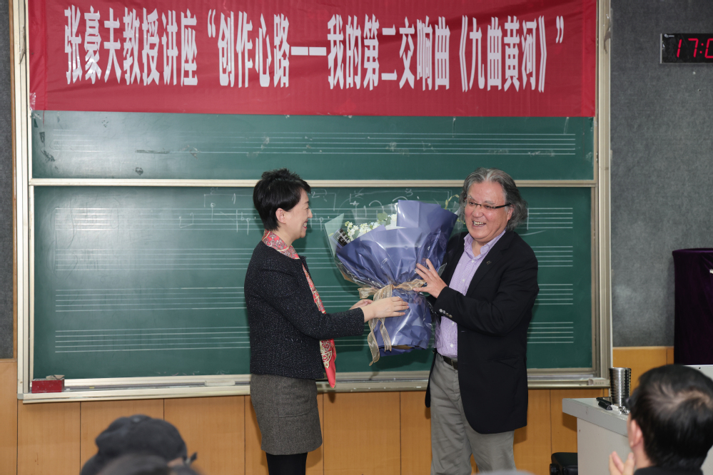 讲座最后,张豪夫教授表示期待大家能写出有自己风格的作品,他也提醒同学们:“我们每一部新作的问世,都是自己与历代大师的一次心灵对话,都会受到传统文化的审视。是否‘有品位、有情操、有修养’?是否符合‘理、意、趣、法、神、妙、能、逸’的标准?要做到这一切,就必须沉下心来、耐住性子,一点一滴地积累和创作。”吴延教授代表参会师生对张豪夫教授表示感谢,整场讲座紧凑热烈,意犹未尽。张豪夫教授答疑解惑的同时,用交响曲《九曲黄河》回报母校,体现了他对中国,对母校的赤子情怀,同时也为广大学子树立了良好的人生榜样。