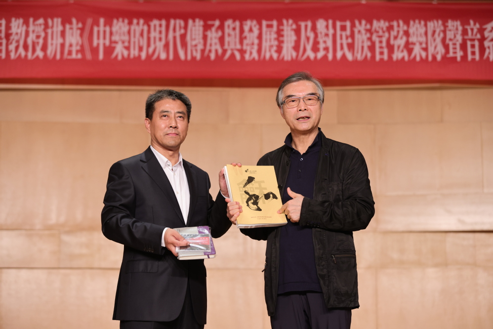 讲座最后,李宝杰教授代表学校对阎惠昌教授的精彩讲座致以诚挚的谢意。张豪夫教授向阎惠昌教授赠送他创作的唢呐与民族管弦乐队《大漠长河》,该作品是张豪夫教授应香港中乐团委约改编的民族管弦乐队版本。阎惠昌教授向学校赠送香港中乐团演出纪念册。