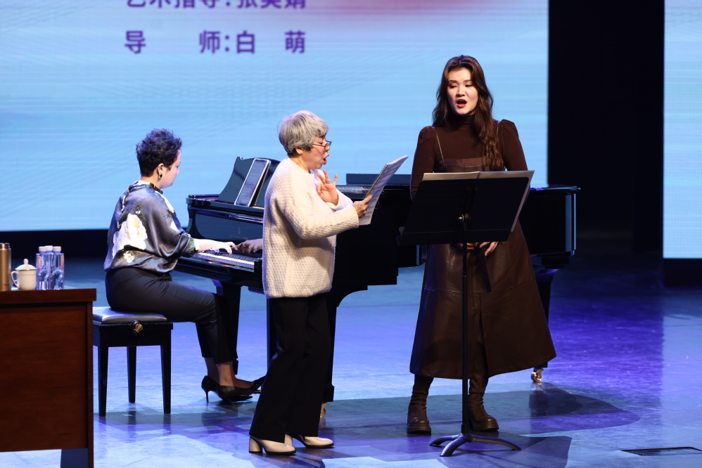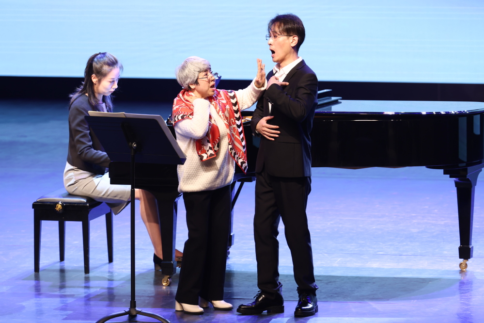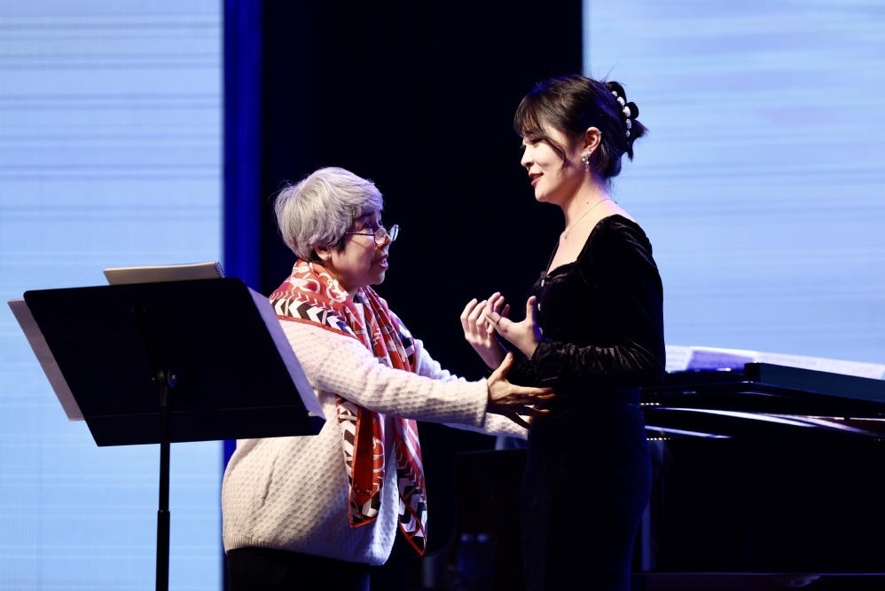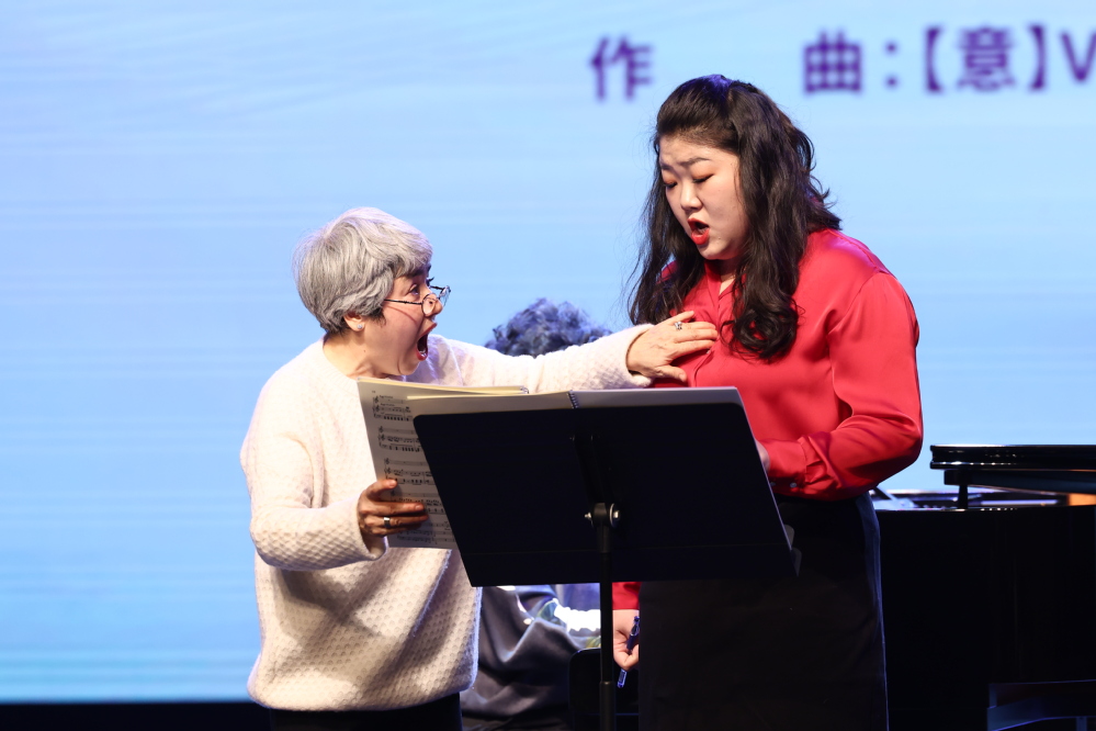 讲座中,迪里拜尔教授以西安音乐学院研究生演唱的五首作品为例,围绕声乐演唱当中的发声原理、声音位置、作品处理、歌剧中人物角色的把握、情感处理及表情术语记号等内容进行了详细耐心的讲解。其中重点分析了张馨瑞演唱的咏叹调《耳边响起他的声音》及崔丁元演唱的古诗词艺术歌曲《枫桥夜泊》。