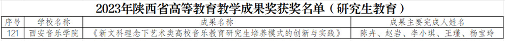 陕西省人民政府公布了2023年陕西省高等教育教学成果奖评选结果,我校陈卉等教师完成的《新文科理念下艺术类高校音乐教育研究生培养模式的创新与实践》获陕西省2023年高等教育教学成果(研究生教育)二等奖。