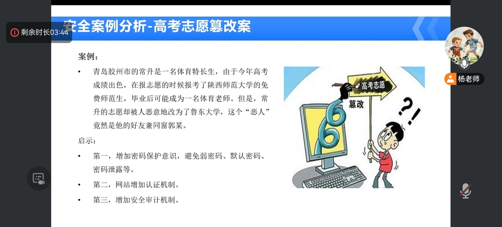 在正版软件使用方面,杨老师强调办公软件要妥善保管账号密码,核验文档来源,加密存储敏感内容,利用云服务同步数据时需定期本地备份;操作系统需养成及时更新和设置复杂密码的习惯。针对邮箱安全,她解析了钓鱼网站和钓鱼邮件两类攻击,结合西北工业大学邮件系统遭境外攻击案例,警示点击可疑内容风险,提醒办公邮箱勿用于注册第三方平台。在密码安全上,分享构建强密码、定期更换、借助密码管理器等策略,以“高考志愿篡改案” 为例,强调提升密码保护意识。对于移动应用安全,提出 “四不” 防范原则,包括不越狱、谨慎授权、不扫不明二维码、警惕网上测试。最后聚焦个人信息安全,解析隐私信息类别,解读《个人信息保护法》,提醒增强信息保护意识。