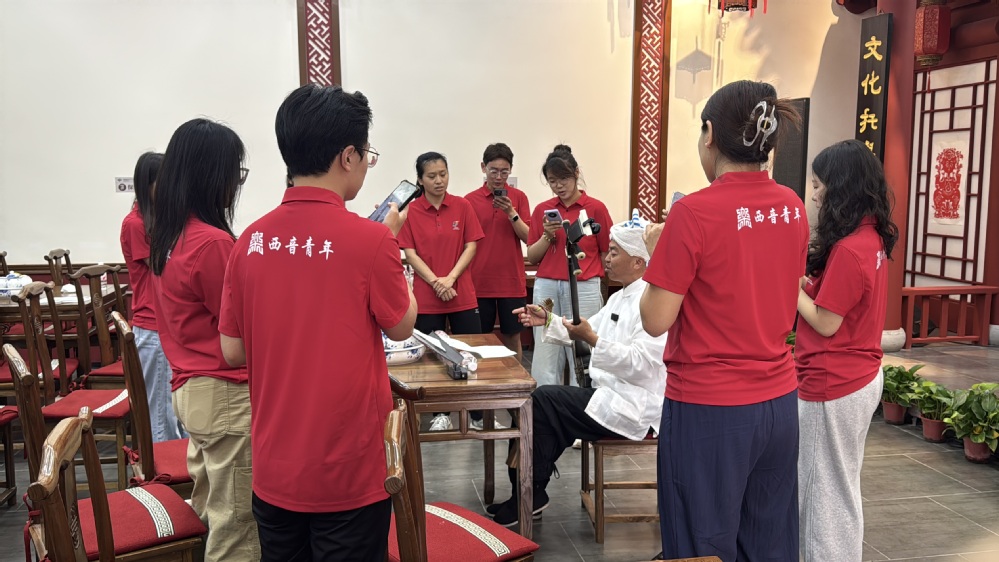 12日上午,实践团队前往绥德县文化馆,在此开展了研究生校外实践基地、美育共同体建设协作基地的挂牌及交流活动。同学们在文化馆内聆听了多位优秀歌手及传统艺人演唱的陕北民歌及绥德平安书,艺术家们用质朴的歌声传递着黄土高原的深情,现场掌声不断、气氛热烈。