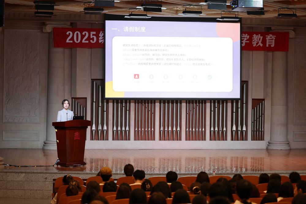 典礼之后,研究生部三位教师为新生开展了入学教育,为未来的学习和研究指明方向。研究生部路敏老师向新生系统讲解了研究生学籍管理及培养全过程的相关规定,并对研究生教育综合管理系统的使用进行了详细指导。研究生部刘晶漪老师围绕研究生培养计划和课程设置进行了说明,重点强调了学分要求和成绩考核标准。2025级新生辅导员马琼烨老师则召开了入学思想教育主题班会,向新生介绍了各项规章制度,开展了日常安全教育,就党团关系转接及入团入党事宜作了说明,并帮助学生建立职业规划意识。