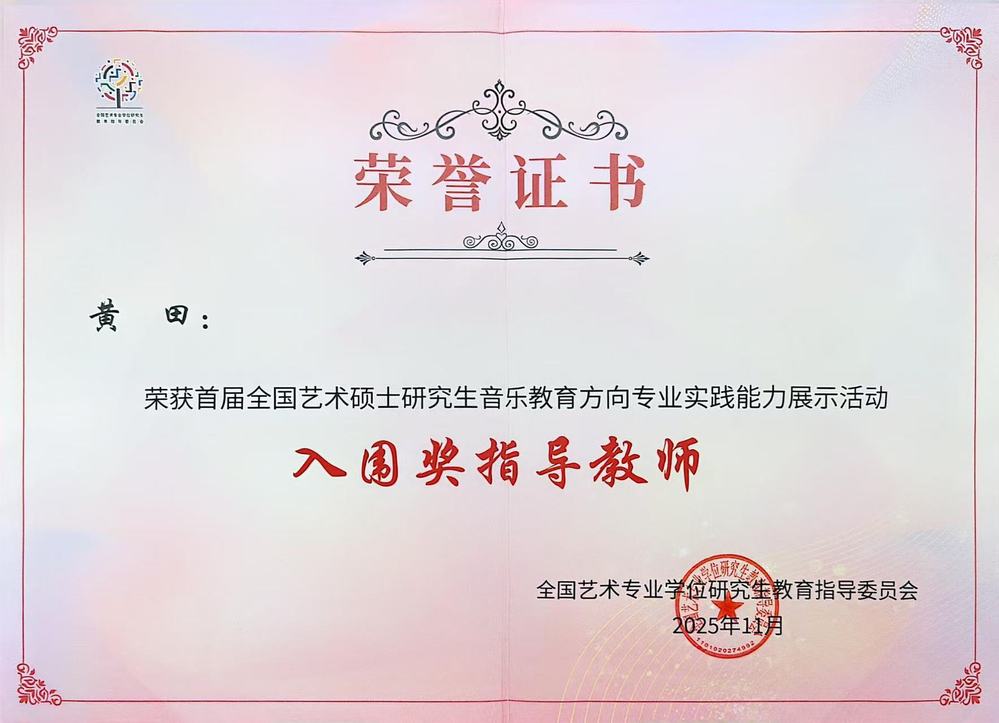 近日,由全国艺术专业学位研究生教育指导委员会主办的首届全国艺术硕士研究生音乐教育专业实践能力展示活动在东北师范大学圆满落幕。我校两位研究生史佳璐(指导教师:赵垒)、朱一丹(指导教师:黄田)凭借扎实的专业素养和稳定的现场发挥,双双荣获“入围奖”,赵垒、黄田两位老师获“入围奖指导教师”称号,我校也以出色的组织工作获评“优秀组织单位奖”。