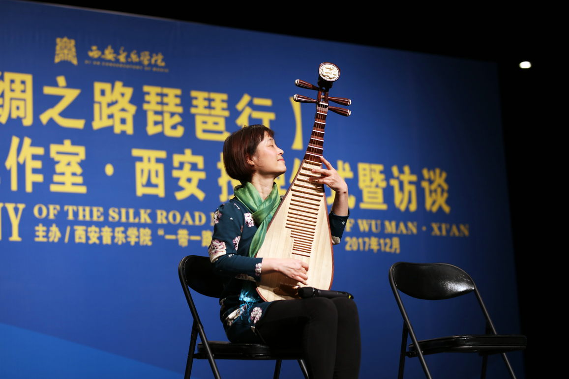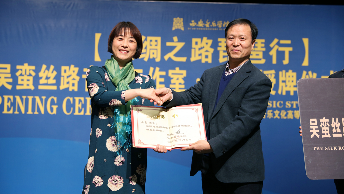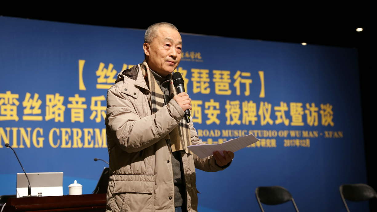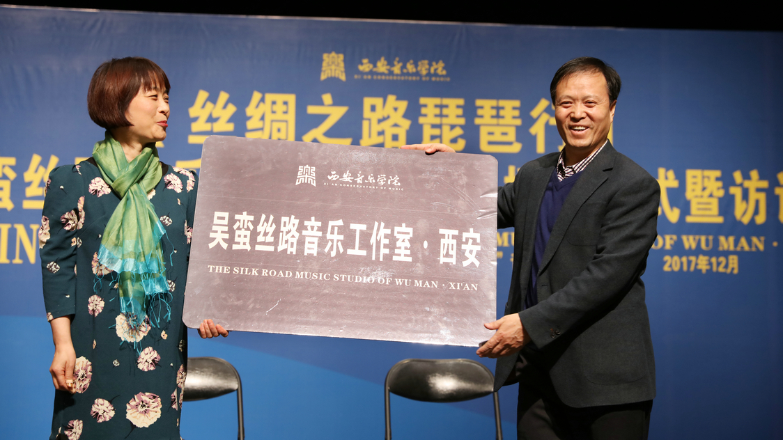2017年12月5日上午,“一带一路”音乐文化高等研究院学术周之丝绸之路琵琶行—吴蛮丝路音乐工作室·西安授牌仪式暨访谈在歌剧舞剧厅举行。党委书记张立杰教授为工作室揭牌并为吴蛮颁发聘书。上海音乐学院洛秦教授、西安音乐学院高研院、国际交流与合作处、民乐系等相关部门负责人和相关院系师生代表参加。活动由副院长韩兰魁教授主持。