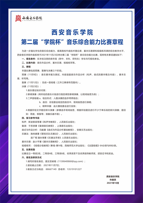 为进一步强化学生的音乐综合能力,提高我校作曲技术理论课、基本乐理课和视唱练耳课的综合教学水平,西安音乐学院作曲系将于2021年11月23日举办第二届“学院杯”音乐综合能力比赛,现将有关事项通知如下: