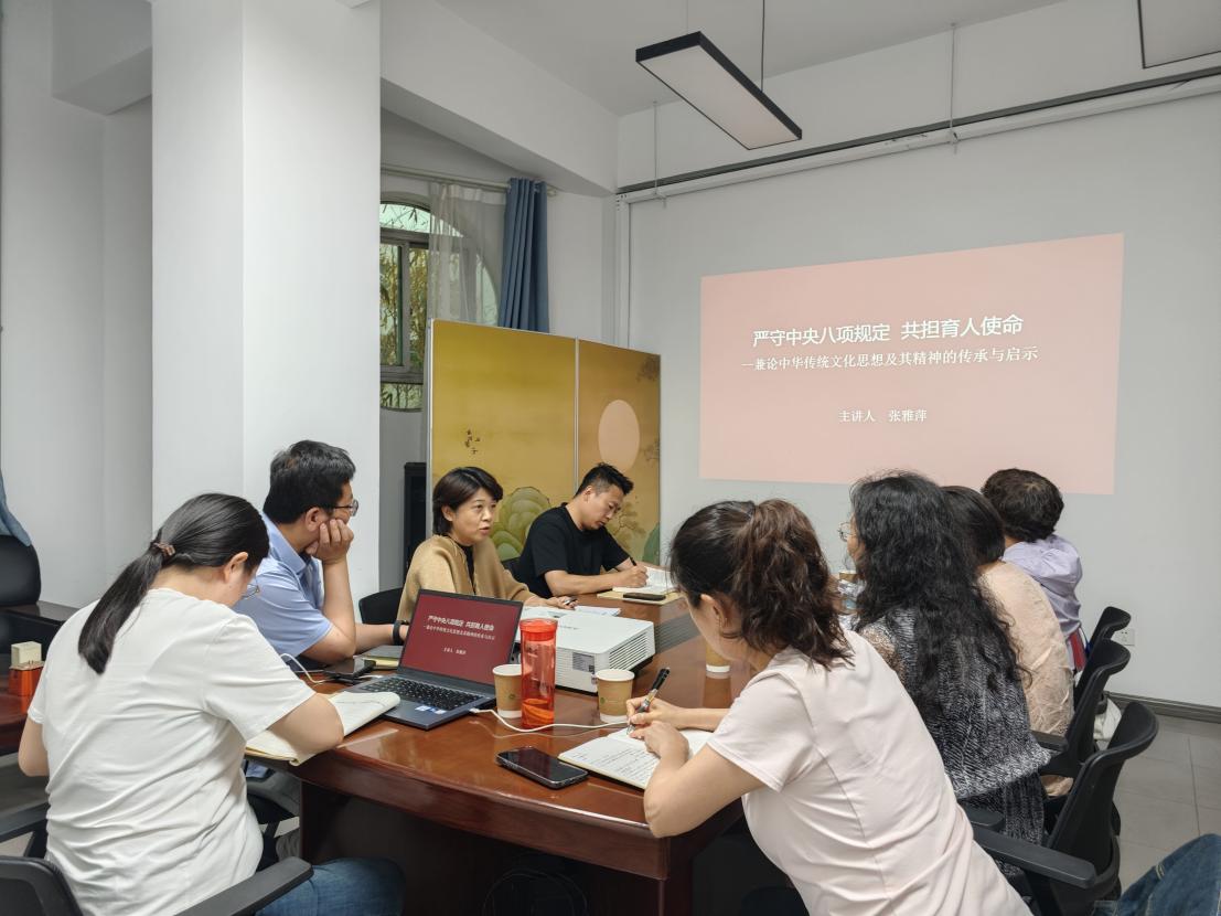 人文学院党总支书记张雅萍从学习教育的政治意义切入,现场讲授题为《严守中央八项规定 共担育人使命》的专题党课。党课系统梳理了中央八项规定的历史脉络与核心内涵,结合中华传统文化中“克己奉公”“戒奢尚俭”“以民为本”等思想精髓,深入阐释了传统廉政文化与新时代作风建设要求的内在契合性,强调要以中华优秀传统文化为精神纽带,将“尚俭戒奢”的价值理念融入育人实践。